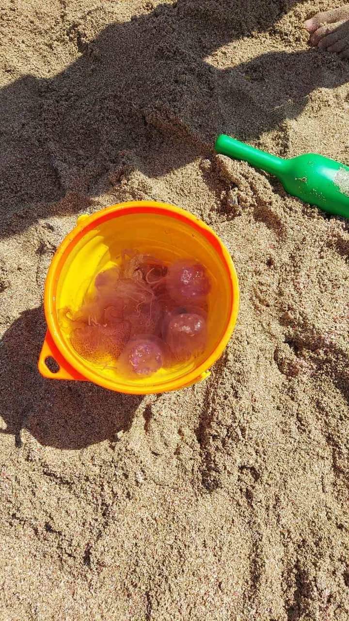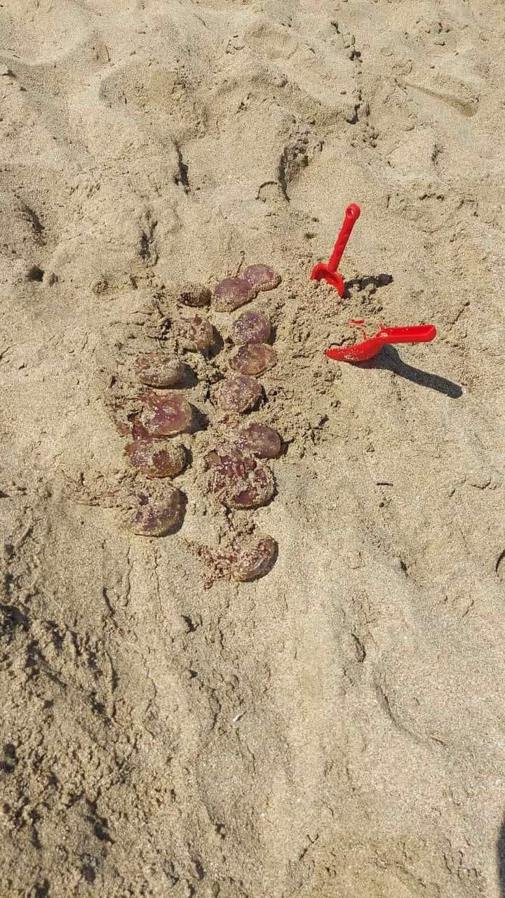 Λουόμενοι στην παραλία, έβγαλαν με κουβά, συνολικά πάνω από δέκα μέδουσες, όπως φαίνεται και σε φωτογραφίες που αναρτήθηκαν στα μέσα κοινωνικής δικτύωσης.