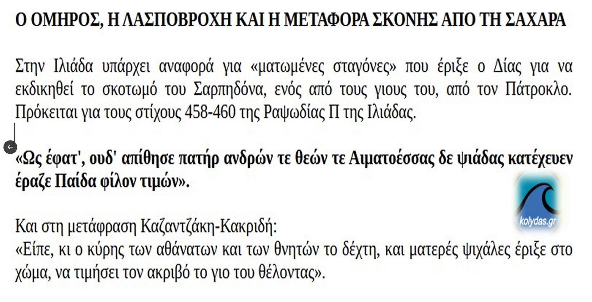 Ο Θοδωρής Κολυδάς κάνει μάλιστα και αναφορά στον Όμηρο και την Ιλιάδα, ο οποίος είχε περιγράψει φαινόμενα "ματωμένων σταγόνων" που είχε ρίξει ο Δίας για να εκδικηθεί τον θάνατο του Σαρπηδόνα από τον Πάτροκλο.