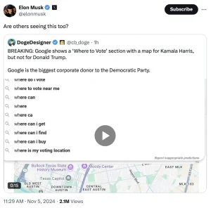 Σημειώνεται ότι ο ιδιοκτήτης του Χ ο E.Mασκ είχε δημοσιεύσει καταγγελίες ότι η Google στην αναζήτηση έδειχνε που να ψηφίσει κάποιος για την Κ.Χάρις αλλά όχι για το Ν.Τραμπ.