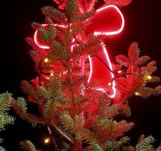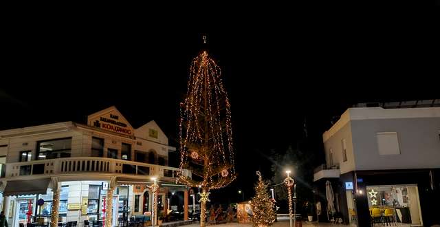 Το ψηλό δέντρο στο κέντρο της πλατείας, σήμα κατατεθέν της πόλης, φωτίστηκε με δεκάδες φωτάκια με ένα μεγάλο άστρο στην κορυφή, ξεχωρίζοντας από μακριά, ενώ δίπλα σε αυτό ένα υπέροχο έλατο συμπληρώσει και ενισχύει τη γιορτινή εικόνα των ημερών. Ανάμεσά τους ένα ξύλινο σπιτάκι με όμορφες φιγούρες αναπαριστά τη φάτνη, ολοκληρώνοντας την εικόνα μιας ξεχωριστής πλατείας.